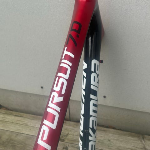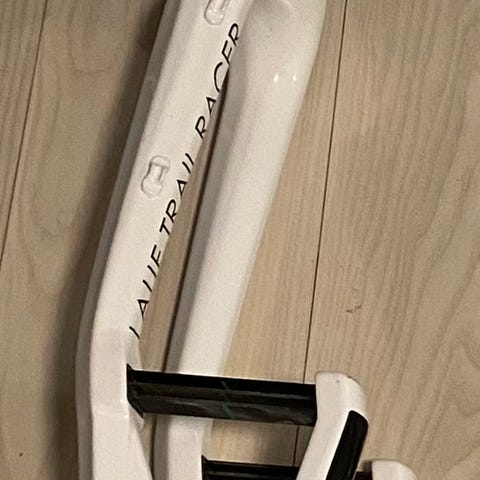 Gaffelen er laget i karbon, med rett kronedel og rette gaffelbein. Dropouts er beregnet for hurtigkobling/QR-hjul. Styrelager-røret er i karbon og avbildet med målebånd for lengdereferanse.