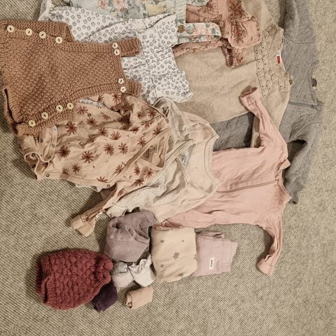 En pakke med jenteklær i størrelse 50 (liten størrelse – passer vanligvis opptil ca. 6 uker, avhengig av barnets størrelse).