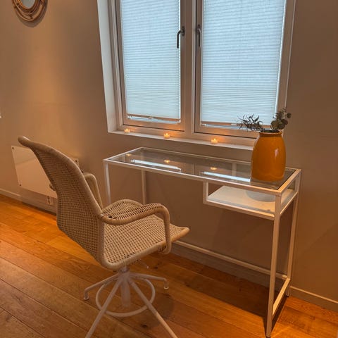 Pulten er i god stand og gir et lett og moderne uttrykk. Bordet har en smal dybde som gjør det egnet langs vegg, i gang, stue eller under et vindu. Passer for deg som ønsker et minimalistisk og stilrent skrivebord uten at det tar for mye plass. Overflaten i glass gir god plass til dekor, lamper eller oppbevaring av mindre gjenstander.