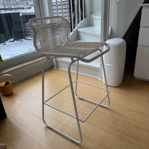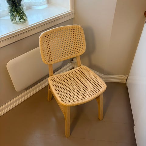 Selger en flott IKEA STIGBYGEL kontorstol i beige/hvit. Stolen er håndvevd i papirhyssing, noe som gjør den unik og gir den et varmt, naturlig uttrykk. Passer like godt på hjemmekontoret som i stuen.