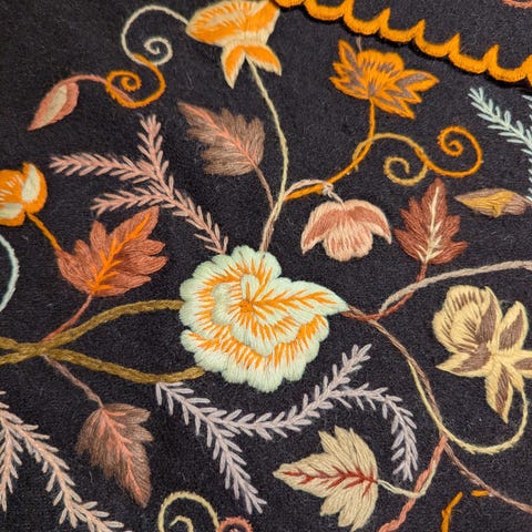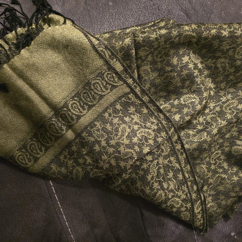 Selger flott karsmir sjal. Med mørkblått i bunn og gul og andre duse farger. Selges HBO 750,-
