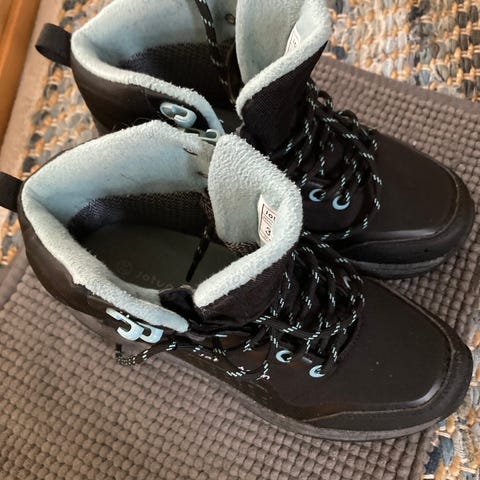 Disse er vanntette med høyt skaft og lunt fleecefor inni samt strikket design i front. Ble litt for store for meg. Passer sikkert en 39 også med tykke sokker inni.