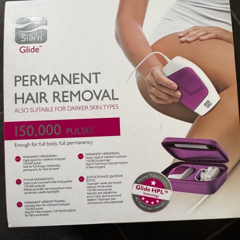 Silk’n Glide hårfjerningsapparat med IPL-teknologi for permanent hårfjerning. Apparatet har kapasitet på 150 000 lysimpulser og er egnet for bruk på kropp og ansikt, avhengig av hud- og hårtype i henhold til produsentens retningslinjer. Leveres i kompakt størrelse og er designet for hjemmebruk. IPL-teknologien bruker lysimpulser til å redusere hårvekst over tid ved regelmessig bruk. Apparatet kobles til strøm under bruk og har kontrollknapper på enheten for justering av innstillinger. Passer for voksne brukere som ønsker langvarig reduksjon av hårvekst på ulike kroppsområder innenfor anbefalt hud- og hårtypeområde.