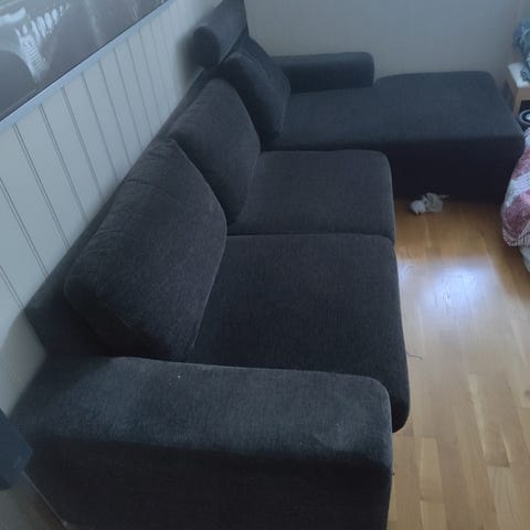 Sofaen har grå trekk med strukturmønster og består av fire moduler, tre like kvadratiske og en sjeselong modul. Nå montert som en U men trolig kan settes sammen som en lang side plus sjeselong (lit usikker på dette). Fem store puter og fire små rygg/hode puter. Trekk kan ikke vaskes i maskin. Noen synlige brukstegn/flekker.
