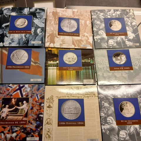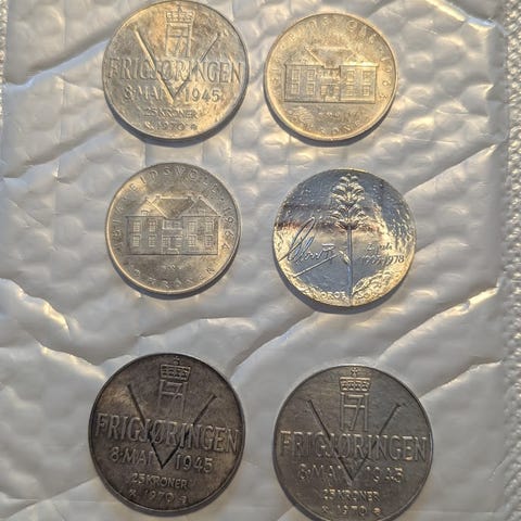 Selger 4 ulike sølvmynter, muligens litt oksidering, men veldig pene mynter.