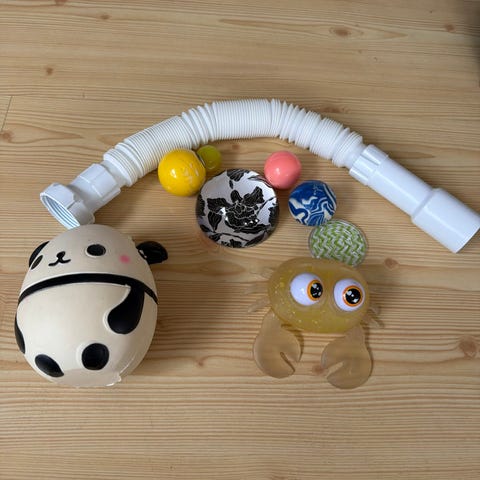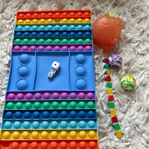 Sett med ulike fidget-leker i plast og metall i flere farger. Inneholder blant annet små blekksprut-formede figurer med pop-it-bobler, fleksible staver, en håndspinner og en leddet kjedeleke. Egnet som sanseleker, til rolige fingre eller som småplukk til lek. Passer for barn som liker å fikle med små leker. Eventuell anbefalt alder følger vanlig sikkerhetsmerking for slike produkter.