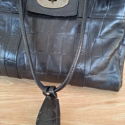 Mulberry skinnveske for dame i svart lær. Vesken har doble bærehåndtak og klassisk turnlock-lås i metall foran. Innvendig har den glidelåslomme og åpne lommer for organisering av innhold. Egnet som hverdagsveske eller jobbveske med plass til det mest nødvendige. Laget i skinn med strukturert form som holder fasongen ved bruk. Brukt en gang til photoshoot. Kjøpt på høyer Jessheim, koster ny 17.000kr kommer med dustbag