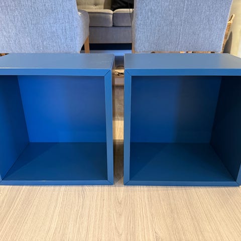 Pent brukte hylleseksjoner uten synlige bruksmerker. Opprinnelig veggoppheng medfølger. Farge azur, hver seksjon er 70 cm bred. Dybde 30 cm og høyde 35 cm. Kan selges hver for seg men helst sammen.