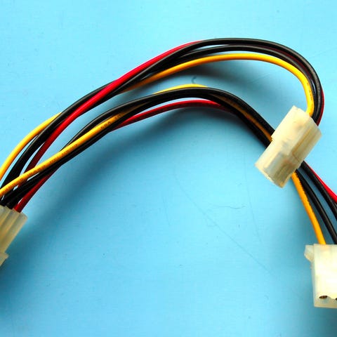 Rydder i PC-boden og selger unna diverse deler som kan komme andre til nytte. Dette er en Molex Y-splitterkabel som gjør det mulig å koble to enheter til én Molex-plugg fra strømforsyningen.