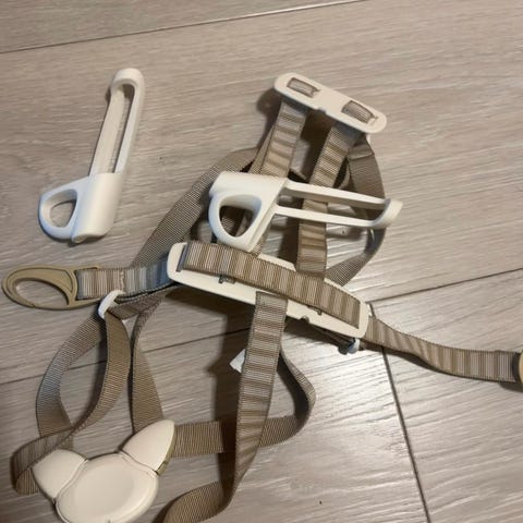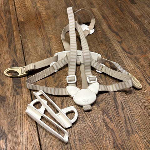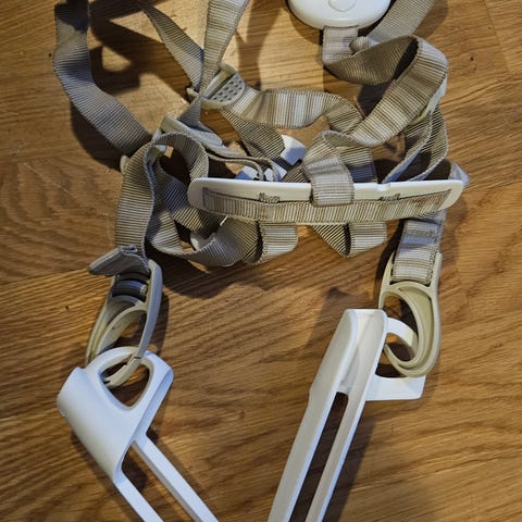 Stokke sele til Tripp Trapp stol i beige. Selen består av justerbare stropper og plastfester som monteres på stolen. Den er laget for å gi ekstra støtte og holde barnet på plass i stolen. Passer til Stokke Tripp Trapp