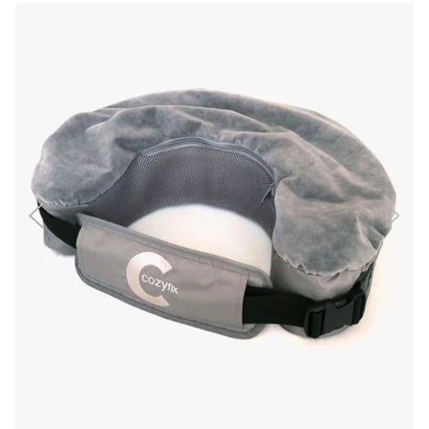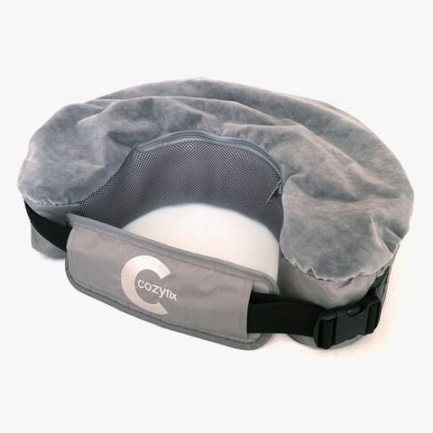 Cozyfix ammepute i beige og svart. Puten er formet som en halvmåne og festes rundt livet med regulerbar stropp. Yttersiden har mykt beige trekk, mens innsiden og festedelen er i svart materiale. Egnet som støtte ved amming eller flaskemating, og gir stabil underlag for barnet samtidig som den avlaster den voksne i rygg, skuldre og armer.