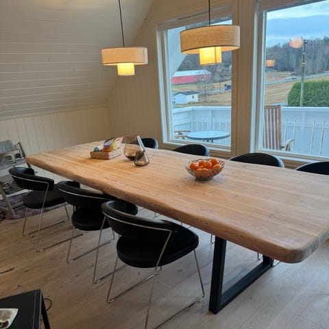Har du lyst på et unikt og rustikt spisebord til hytta? Lages etter mål. Pris avhenger av størrelse og utforming. Det går også å bestille en tilhørende benk hvis ønskelig.
