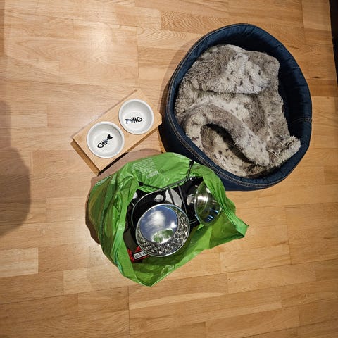 Potesokker, to gensere, leketunnel,halsbånd og sele. Alt dette selges samlet. Passer til liten hund.