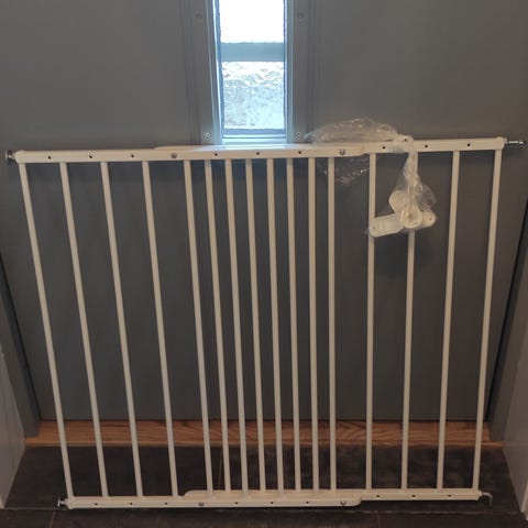 Sammenleggbar sikkerhetsgrind i hvit utførelse. Grindens paneler er hengslet slik at den kan foldes sammen for enkel lagring når den ikke er i bruk. Egnet som barnegrind eller husdyrgrind for å sperre av åpninger, trapper eller rom. Monteres fast i vegg eller karm med festeanordningene som er integrert i endepartiene. Materiale ser ut til å være plast eller lakkert metall med glatte flater som er enkle å tørke av.