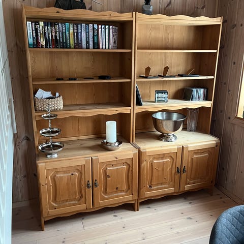 Pen og praktisk hylleseksjon med bjørk overflate, IKEA standard moduler med høyde på 200cm og bredde 20cm, 60cm og 80cm