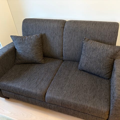 Sovesofa 3-seter i beige tekstil. Sofaen har rette linjer og knappestikking i rygg og sete. Egner seg som sitteplass på dagtid og kan brukes som ekstra soveplass ved behov. Passer i stue, gjesterom eller hybel.