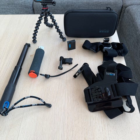 GoPro-actionkamera med diverse tilbehør. Pakken inkluderer kamera, bæreveske, flytende håndgrep, hodefeste, flere fester og skruer, ekstra batterier og kamera-til-USB-kabel. Jeg inkluderer et ekstra batteri (3 i stedet for 2) som vanligvis ikke er inkludert i pakken. I tillegg kan du for 100 kr ekstra kjøpe polarisatoren fra merket Freewell som et separat polarisasjonsfilter med etui (verdi 200 kr). Passer for bruk til filmaktiviteter der et kompakt og robust kamera er ønskelig, for eksempel fotturer, sport og reiser.