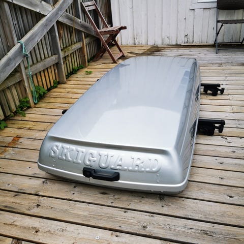 Lasteholdere brukt til en ukes ferie. Kostet nesten 5000 som ny. Skiboks synlig brukt, men uten skader
