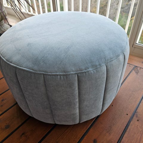 To ovale sittepuffer til salgs. Størrelse 57x41, høyde 38. Det medfølger trekk for oppbevaring. Selges samlet.