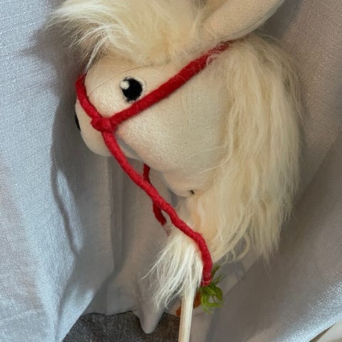 kjepphest, hobby horse, Søstrene Grene, leke, rollelek, barnerom, hest, sele, trestang, vintage, retro
