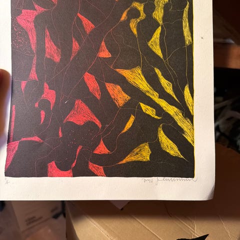 Signert grafisk verk i sterke, flerfargede toner. Bildet er innrammet med lys passepartout med rød kantlinje og gullfarget ramme. Motivet har et abstrakt uttrykk med markerte fargefelt og penselstrøk. Signatur og nummerering er synlig nederst i motivet. Egner seg til oppheng i stue, gang eller kontor. Rammemål er 36,5X44 cm