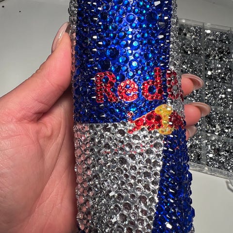 Denne oransje Red Bull-boksen er hånd-bedazzled med rundt 2000 rhinestones, limt på én og én stein. Totalt brukt ca. 5 timer arbeid, så dette er et lite kunstverk