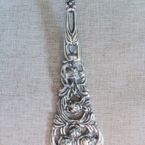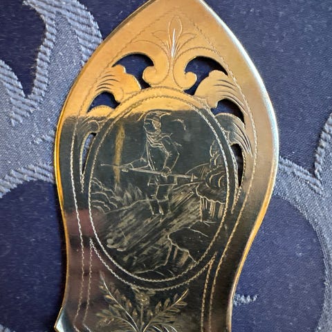 Spaden har detaljert ornamentikk med figurmønster på håndtak, både fram-og bakside. Bladet har gjennombrutt (gitter) design. Overflaten har synlig patina som gir et eldre preg.