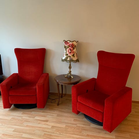 Selger 2 stk rosa lenestoler med puff for besteforeldrene mine.