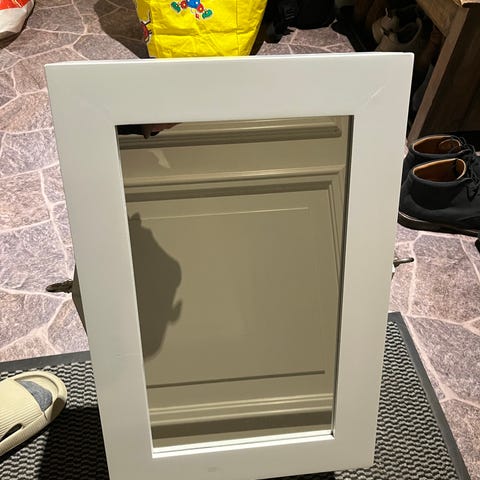 Rektangulært speil med grå ramme. Baksiden har festeanordning for oppheng på vegg.