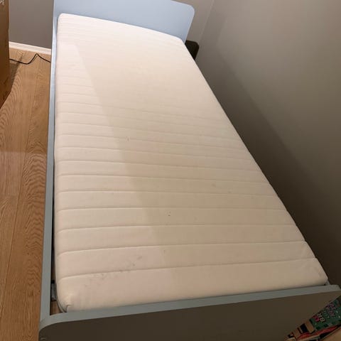 enkeltseng med madrass. Sengen har en grå sengebunn/ramme med treben og kommer med madrass.