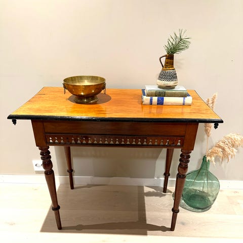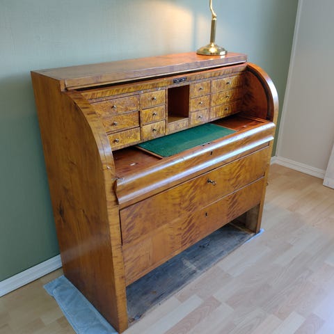Sjelden mulighet! Solid og vakkert skrivebord i flammebjørk fra ca. 1920-30 -tallet, i klassisk “teacher’s desk”-stil. Bordet har fire romslige skuffer på høyre side og en praktisk uttrekkbar ekstra plate som gir større arbeidsflate når du trenger det. Dette er et tidløst og funksjonelt møbel som passer perfekt som skrivebord, hjemmekontorpult eller dekorativt vintage-innslag i stue eller soverom.