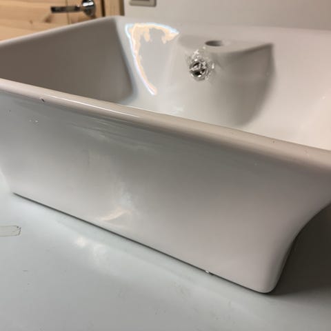 Hvit rektangulær servant med integrert kum og hull for armatur. Servanten har overløp og er utstyrt med ettgreps blandebatteri i kromutførelse. Egnet for montering på baderomsinnredning eller som frittstående toppmontert servant, avhengig av løsning og festeanordning som brukes.