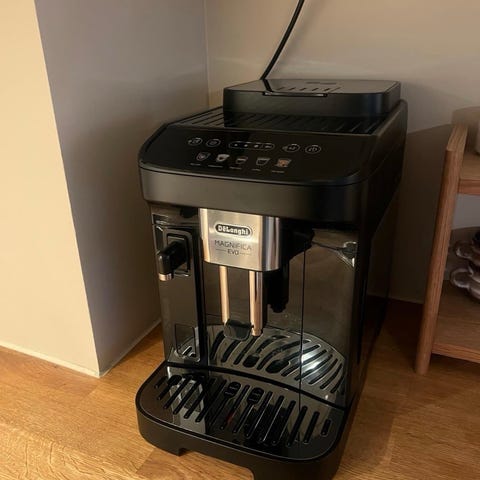 Siemens helautomatisk kaffemaskin i sølvfarge. Maskinen har integrert kvern på toppen for hele bønner og frontpanel med display og knapper for valg av ulike kaffetyper. Uttak for kaffe er plassert midt på fronten, med dryppbrett og rister i rustfritt stål under. Belysning ved koppområdet gir oversikt under brygging. Maskinen er egnet til tilberedning av svart kaffe og andre kaffedrikker basert på hele bønner, og passer til bruk på kjøkkenbenk i hjem eller mindre kontor.