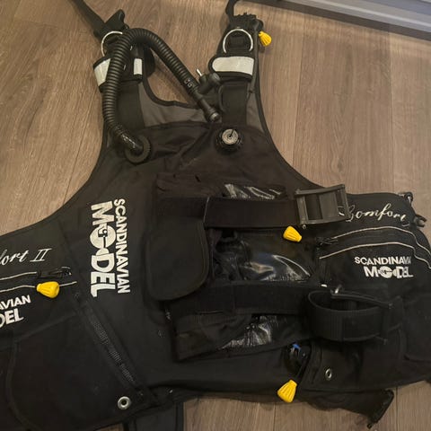 Lite brukt Scubapro KnightHawk BCD i størrelse medium. Produsert og kjøpt ny fra forhandler i 2013. Kun brukt på fire dykk. Ellers lagret tørt innendørs. Vesten har integrerte blylommer og leveres 5 stk blyplater (~8 kg) som vist på bildene. Maksimal flaskestr 18l. Vesten ble trykktestet på Havsport Dykkersenter i Trondheim i sommer. Ingen tegn på lekkasje av blære, og inflator og overtrykksventiler fungerer som de skal. Har ikke vært i bruk etter det. Vesten fremstår i meget god stand.
