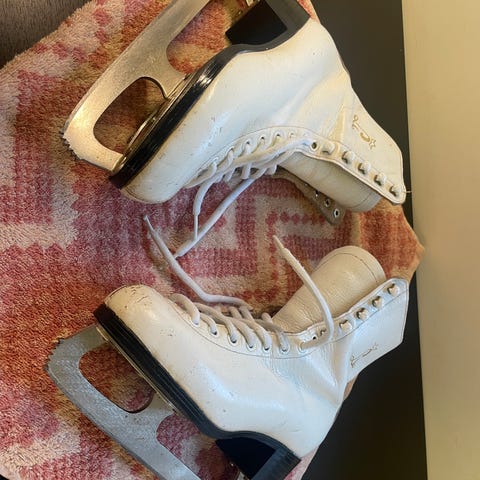 Kunstløpskøyter i størrelse 38. Klassiske hvite skøyter med snøring og høyt skaft som gir støtte rundt ankel. Passer til kunstløp eller generell skøytebruk på isbaner. Såle og hæl er i mørkt materiale, og innsiden har myk polstring for økt komfort ved bruk.