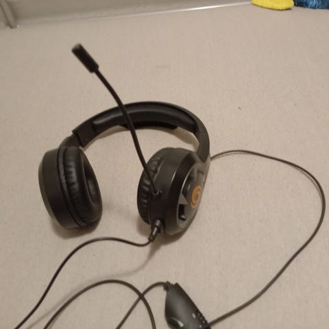 Headsettet er et NOS H225 gaming headset med innebygd mikrofon og kabeltilkobling. Det har polstrede øreklokker og hodebøyle, samt detaljer i oransje.
