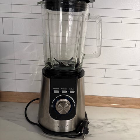 OBH Nordica blender type 7739 med motor på 1400W. Blenderen har glasskanne med måleskala og håndtak i plast. Basen er i sølvfarget metall med svart plastdetaljer. På fronten er det dreiehjul for trinnløs hastighetsregulering fra min til maks, samt knapper for funksjonene smoothie, auto clean, ice crush og pulse. Lokket er avtagbart med åpning i midten. Egnet til blanding av drikker, knusing av is og generell matlaging der man trenger en kraftig blender.