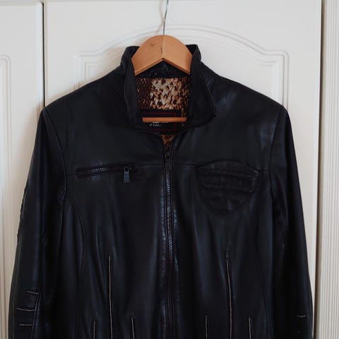Nydelig skinnjakke som når ca ned til lårene. Har tatt ut skulderputene. Den sotter fint på da den er innsvinget i livet.