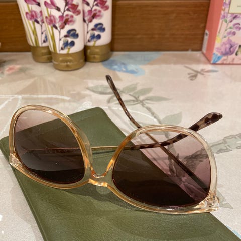 Selger et pent brukt solbrillepar fra Kate Spade. Pussekluten i etuiet er ubrukt. Har kommet noe riper i glasset som man ikke merker når man har på seg brillene. Nypris var 1800 på salg. Fargen er rosa
