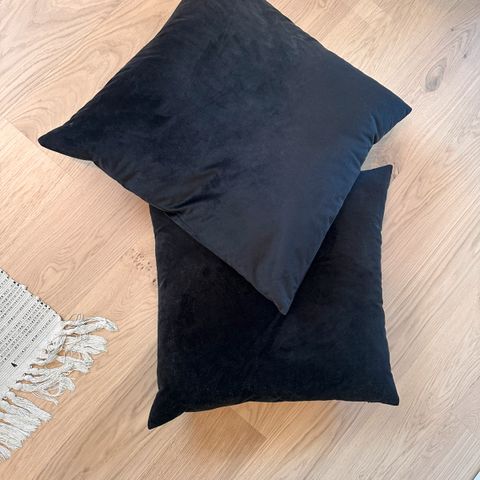 Selger et pent brukt sett med to fløyelsputer i dyp marineblå farge. Putene er myke, komfortable og holder formen godt. Passer utmerket til både stue og soverom.