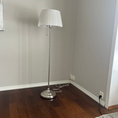 IKEA gulvlampe med hvit plissert lampeskjerm og slank metallstang. Lampen har rund fot i metall og er beregnet for bruk innendørs. Passer som belysning i stue, soverom eller lesehjørne. Bruker standard lyspære med vanlig sokkel (se merking på lampen for riktig type og maks effekt).