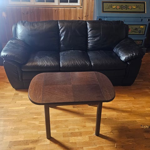 .Sofaen er i orange sky, men har alltid blitt brukt med trekk. Ett lys beige, (se bilder) og ett som er mørkere brunt