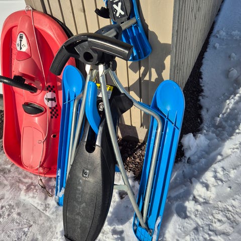 Godt brukt snowracer, en del riper under. Rattet fikk en knekk da far i huset kjørte på et hopp. Fungerer likevel godt, svinger og bremser som den skal, har mye bruk igjen.