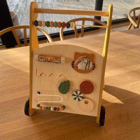 Aktivitetsgåvogn i tre med speil, puttekasse og lekefunksjoner som støtter barnets første skritt og stimulerer sanser og motorikk. En stor og fin trele