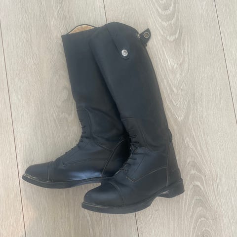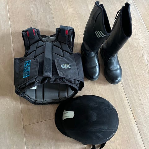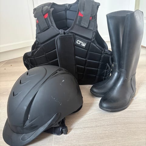 Ridehjelm, sikkerhetsvest str 8 år, ridestøvler str 36, ridehansker og longeringstau selges samlet for kr 400.