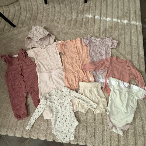 Klespakke med flere plagg i myk bomull, hovedsakelig i rosa nyanser. Bildene viser blant annet langermet body med mønster, kortermet ribbestrikket body, hvit bukse/leggings og rosa selebukse/romper med volangdetaljer.