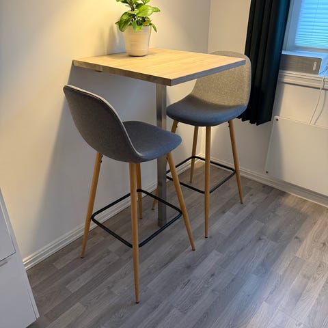 Bordet er stabilt, solid og svært komfortabelt i bruk. Det har vært godt tatt vare på og fremstår i fin stand. Perfekt for mindre kjøkken eller som en praktisk og hyggelig spiseplass.
