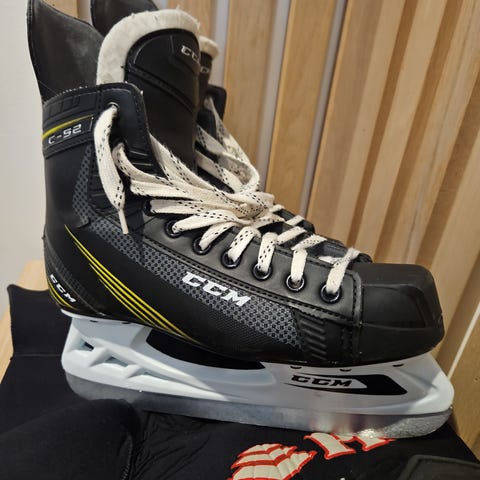 CCM Tacks ishockeyskøyter for barn i størrelse 34. Skøytene har svart og gul overdel med hvite lisser og hvitt fór. De er utstyrt med faste stålskinner tilpasset ishockeybruk. Modellen er egnet for barn som trenger stabile skøyter til trening eller lek på isen.
