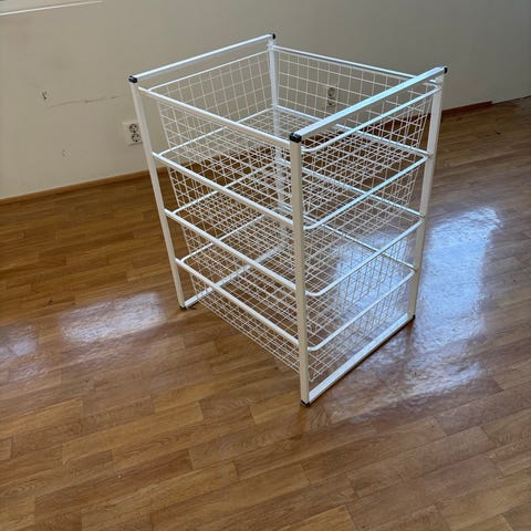 To hvite metallhyller med nettingkurver, selges samlet eller hver for seg. Den minste har seks kurver. Den høyeste består av to like store deler som er festa sammen, en med tre og en med fire kurver. Ganske sikker på at det er IKEA, men det er ikke jeg som har kjøpt de, så vil ikke garantere det.