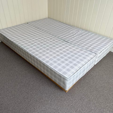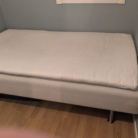 Ribbebunnen består av trelameller. En av plankene i sengebunnen var knekt, og er fikset nå. Passer som enkeltseng på soverom eller barnerom, som dagseng eller dobbeltseng. Madrassmål 80 x 200 når den er sammenslått. Madrass følger ikke med.